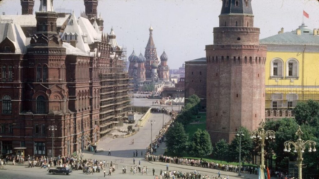 Moscow back in the time of the USSR that contains the people of the nation walking down the street.