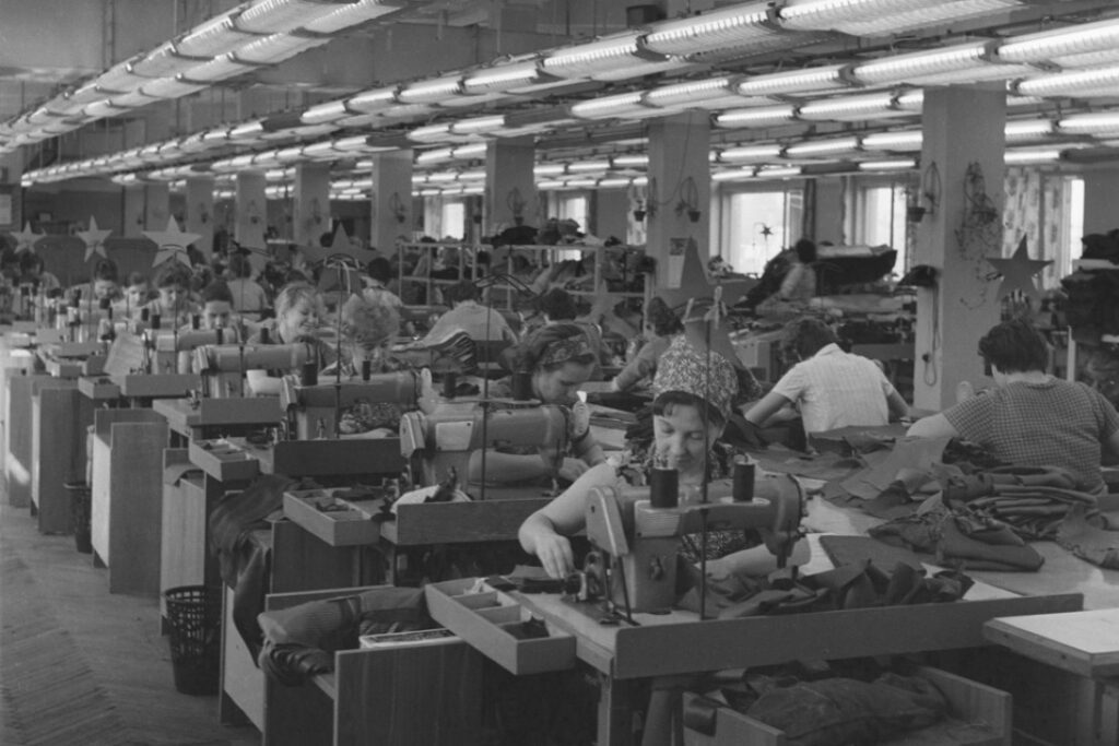 A group of citizens in the USSR sewing clothes for the economic production of the USSR.